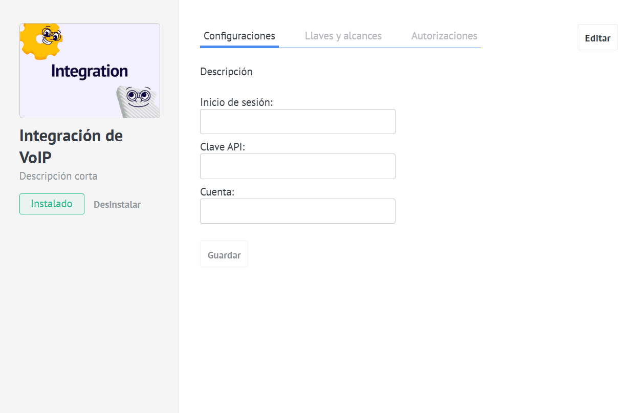 Después de que el usuario instala la integración desde el Centro de integraciones de Kommo, la integración debe mostrar una ventana modal de configuración donde el usuario pueda realizar algunas acciones, como proporcionar las credenciales para acceder al servicio VoIP. Estas credenciales solo las conoce el administrador de la cuenta del servicio VoIP. Otra opción es utilizar OAuth 2.0 para la autorización.