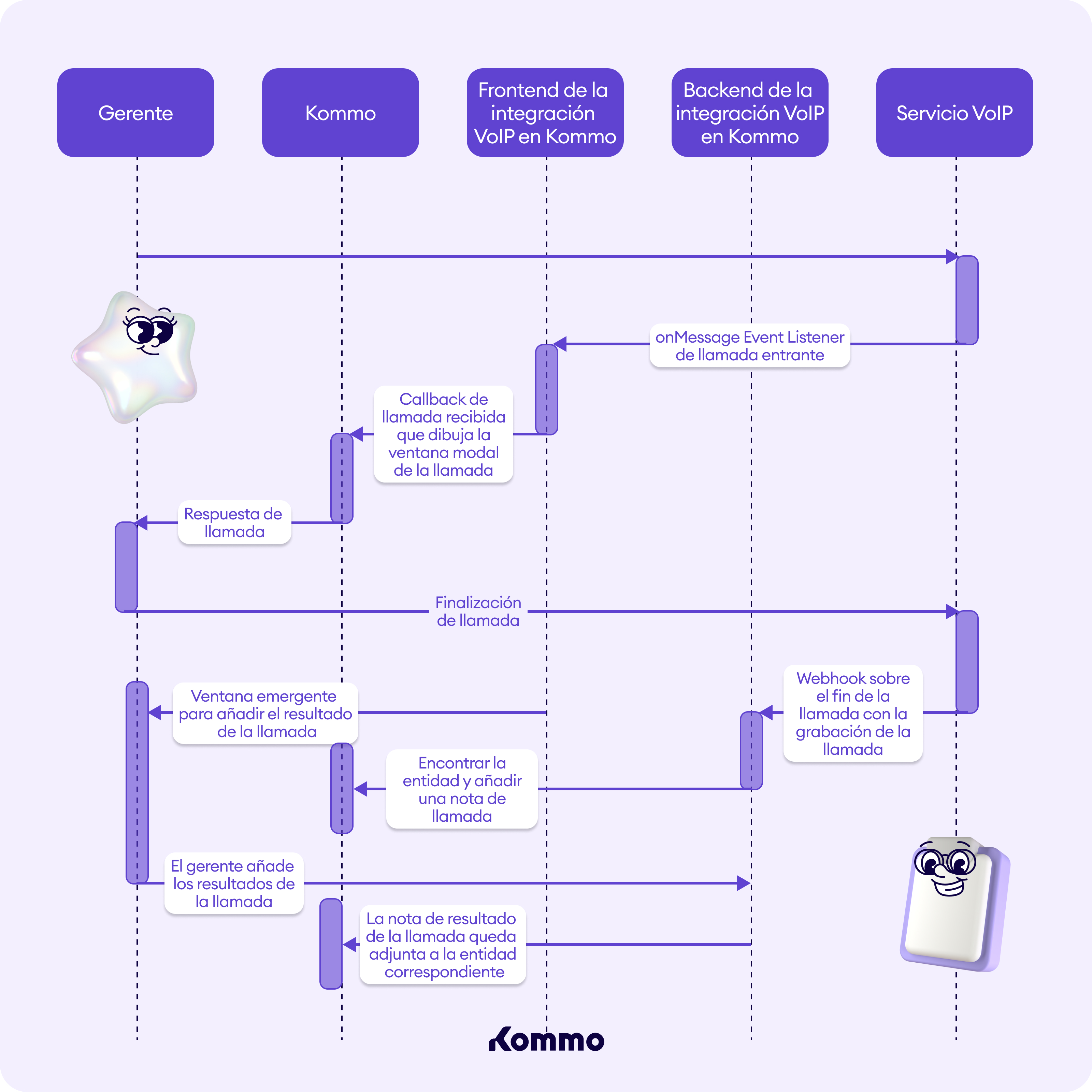 Una vez que la conversación termina, los datos deben registrarse en Kommo mediante la API (si era un cliente; las llamadas entre empleados se descartan).Debes guardar información sobre el llamante, la duración y la grabación de la conversación, así como las notas de la llamada, si las hubiera.
